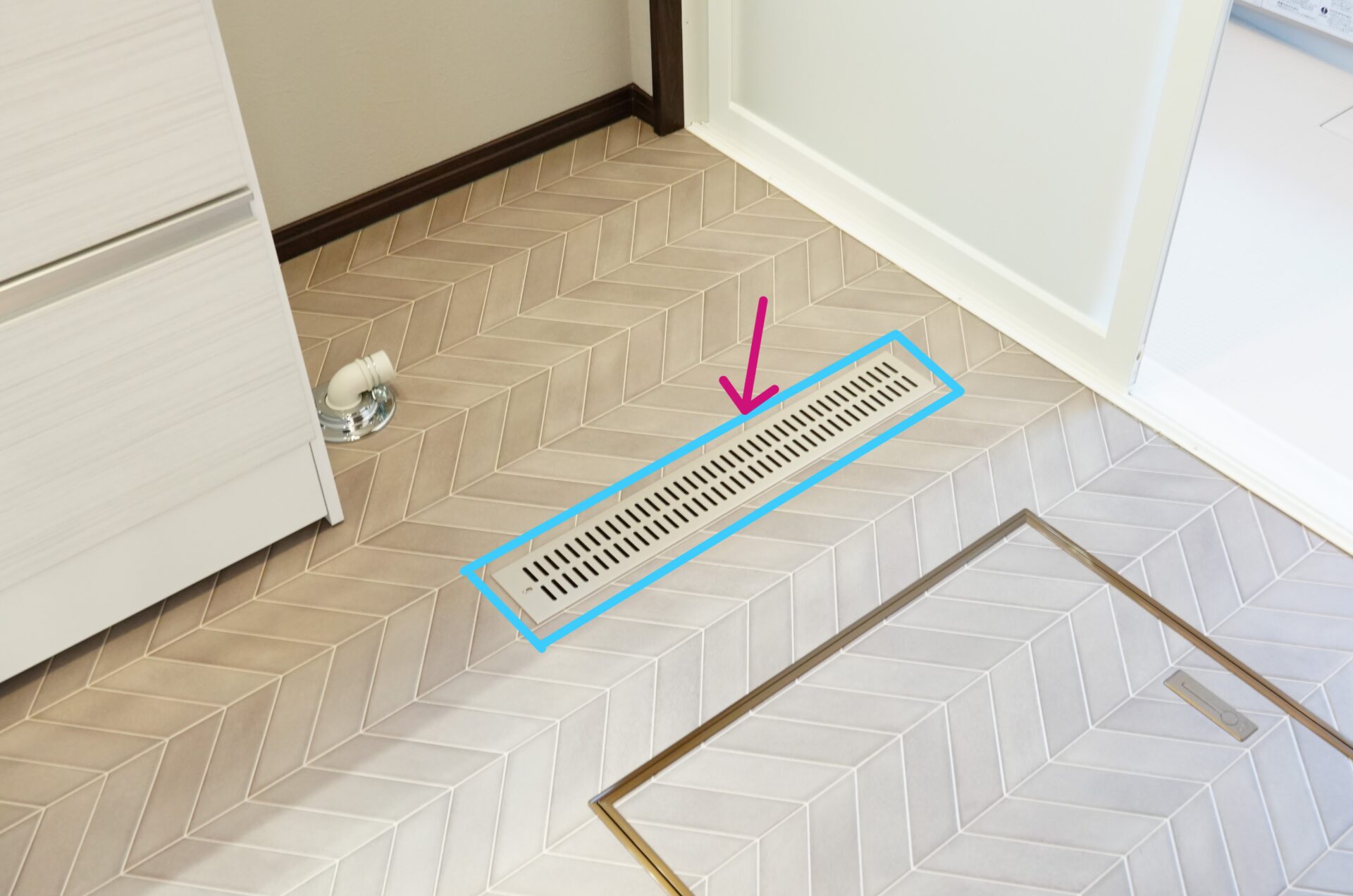 印で示した内の吹き出し口から暖かい空気が出てきてトイレや脱衣所を温めます。