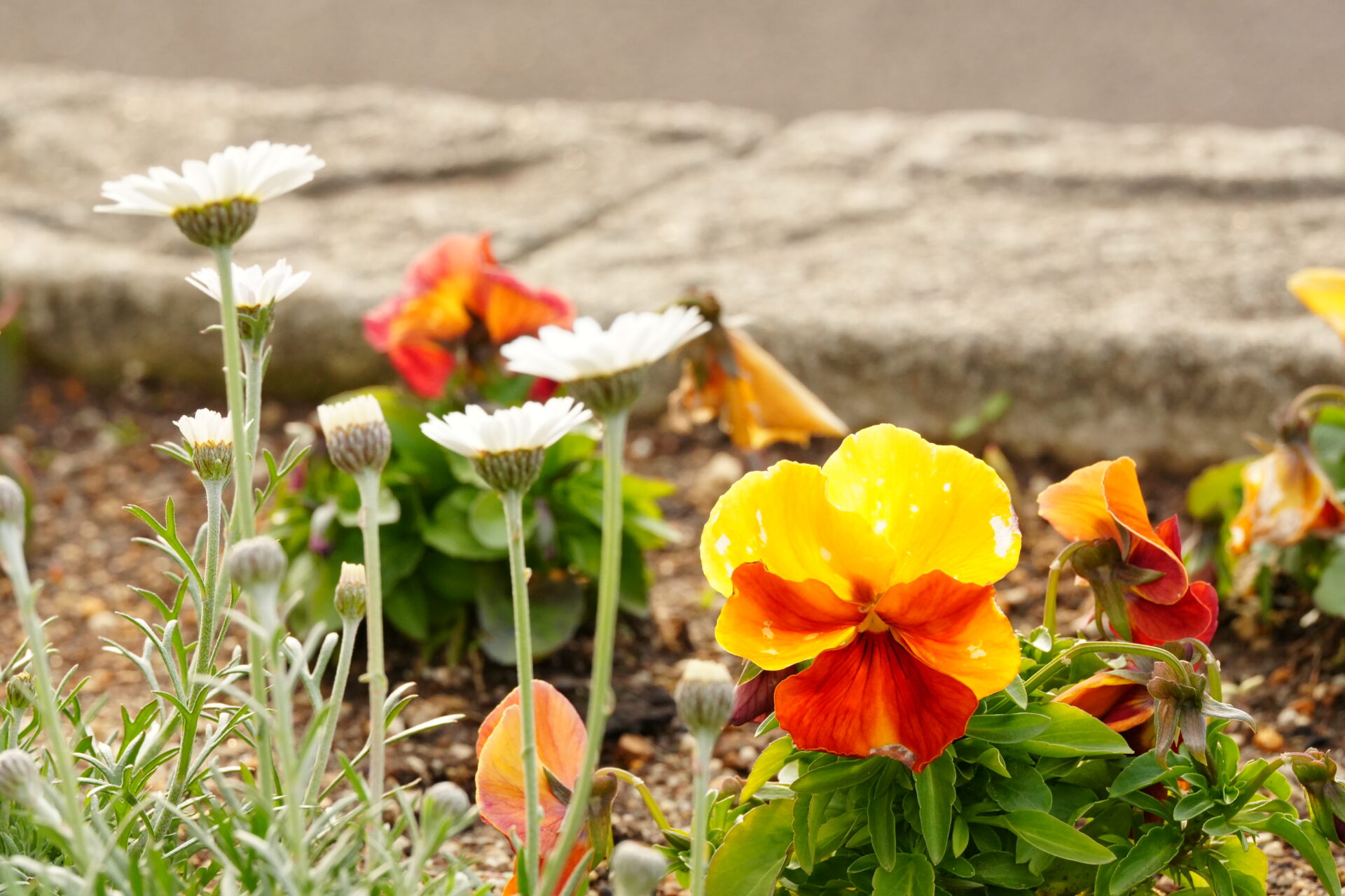 オレンジ色のパンジーが咲いていて