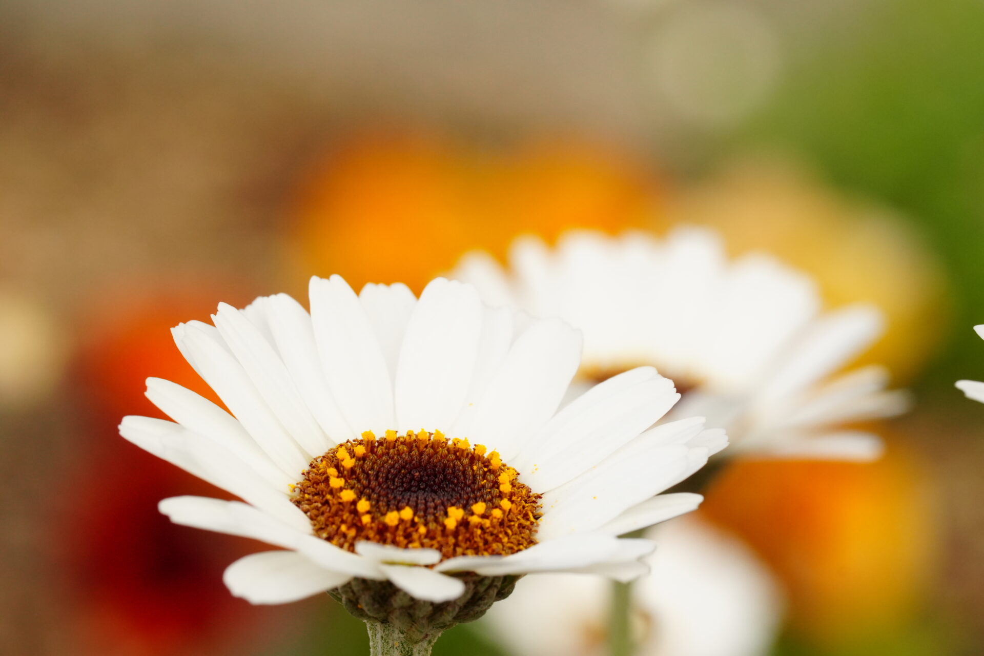 白いローダンセマムの花の周りに