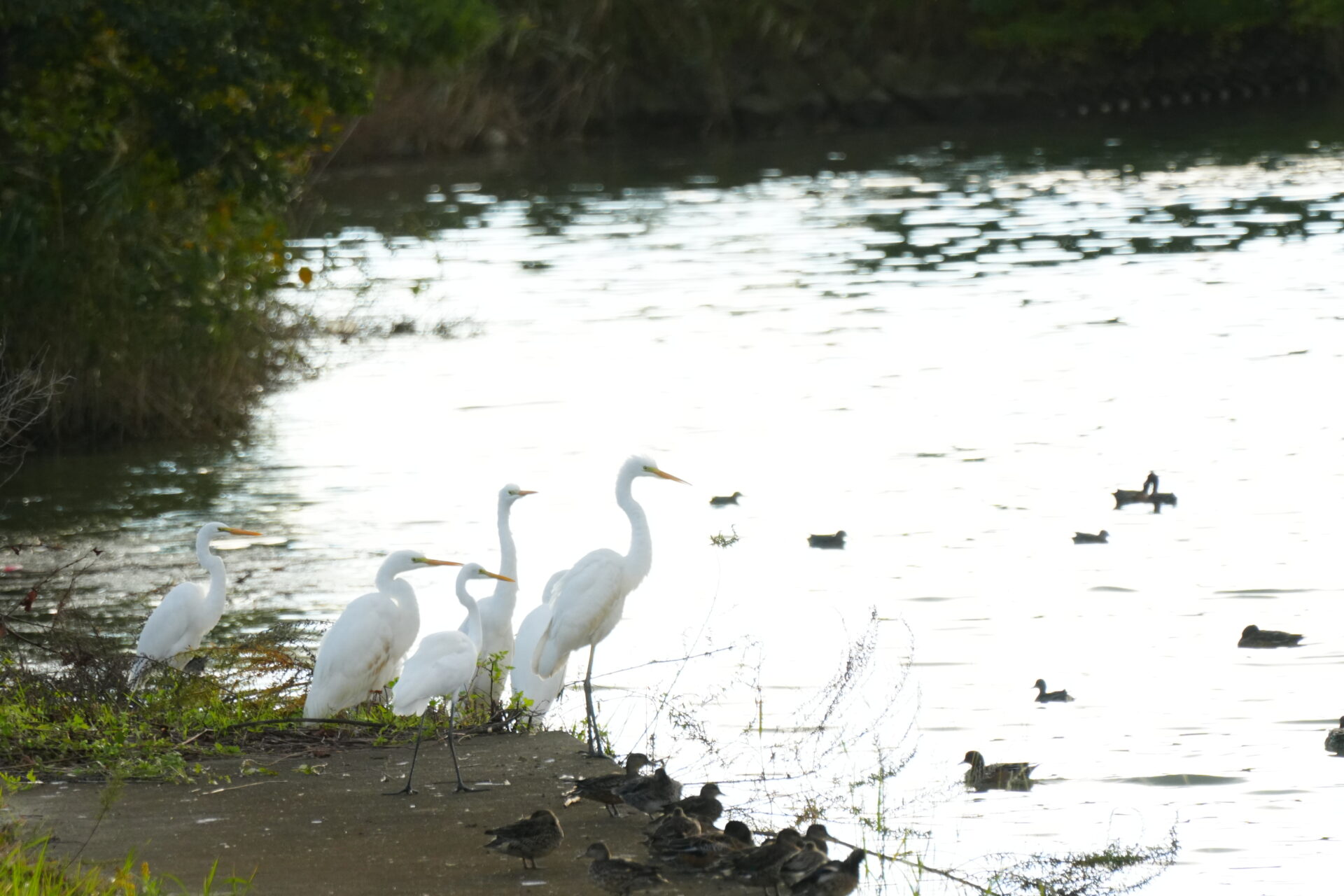 ダイサギ(白い羽の鳥)その手前の小さい鳥たちはコガモです。