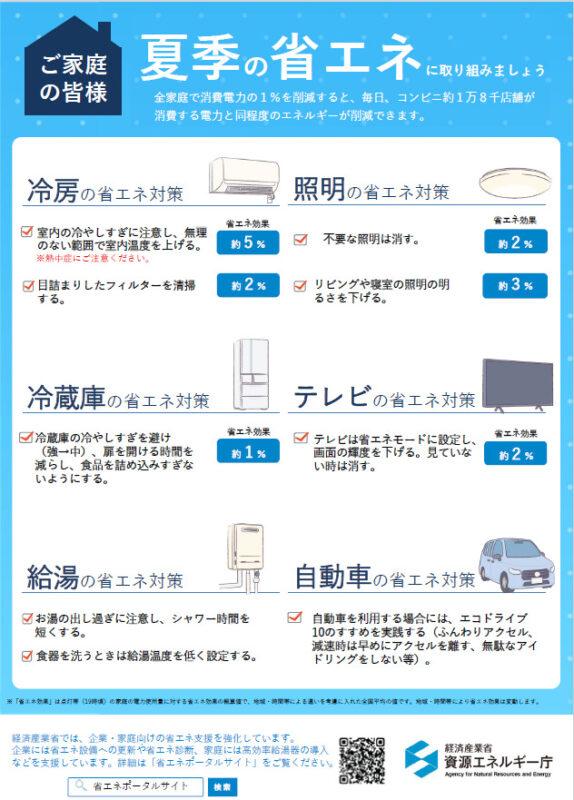 経済産業省 資源エネルギー庁から夏の省エネ対策が出ていましたので載せます。